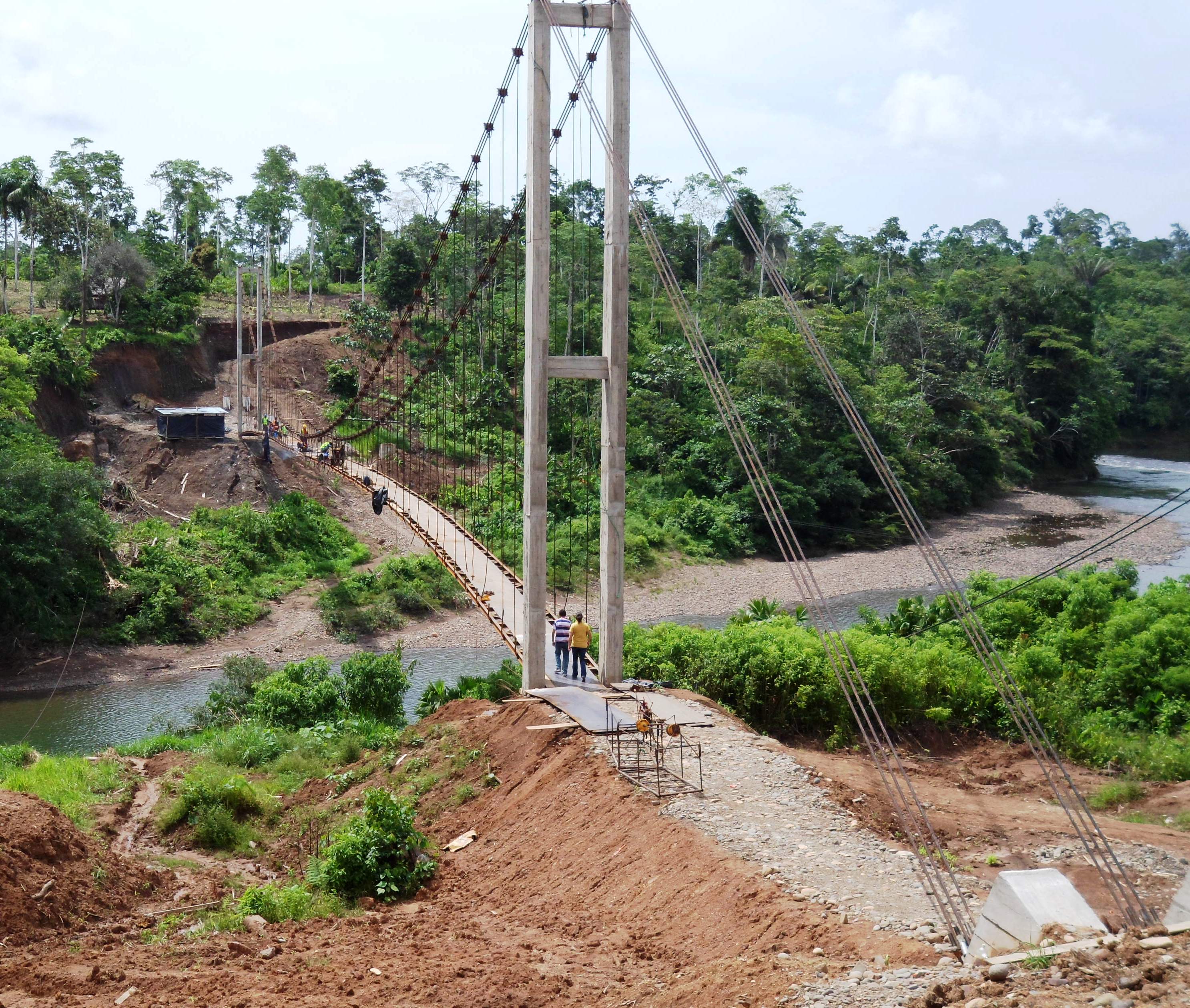 Muy pronto los habitantes de la comunidad Kichwa Cotona y comunidades cercanas del cantón Loreto, van a estrenar el puente colgante sobre el rio Huataraco, obra construida por el ECORAE con una inversión que sobrepasa de los 359 mil dólares. El avance de la cimentación es del 97%.