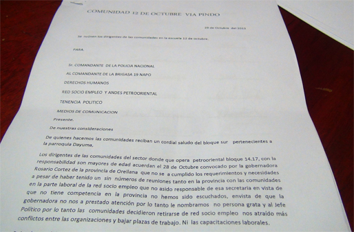 Los inconvenientes habrían surgido por el pedido de los campesinos en exigir ser contratados por la empresa Petroriental que tiene a su cargo los Bloques 14 y 17 en la vía al Pindo. Para agilitar las contrataciones aperturaron una oficina de la Red Socio Empleo en la zona.