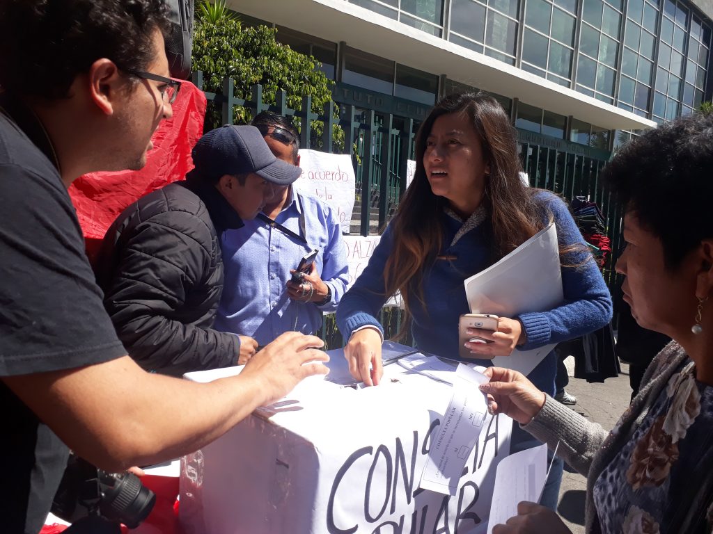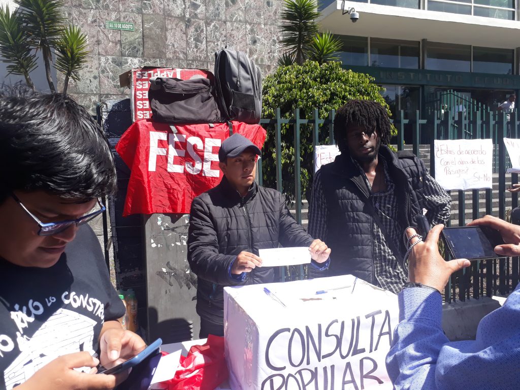 Estudiantes pertenecientes a la Federación de Estudiantes Universitarios del Ecuador FEUE, se concentraron en los bajos de la Caja del Seguro Social IESS, ubicada al centro norte de la capital, donde mediante la colocación de una ánfora realizaron una consulta popular simbólica sobre la posible eliminación del subsidio a los combustibles.