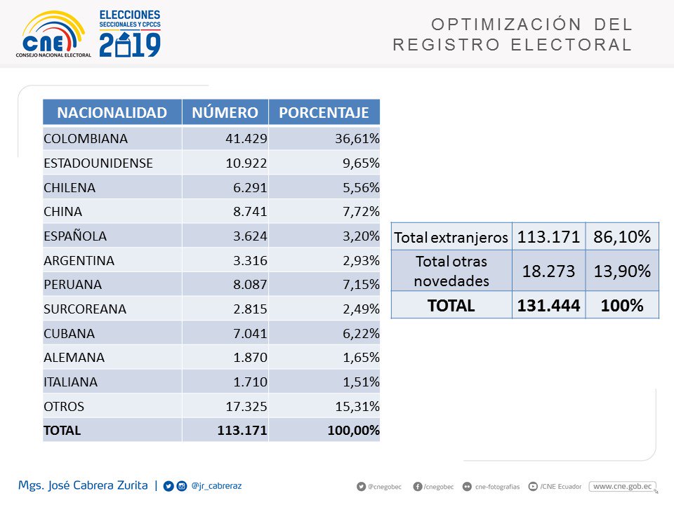 El consejero José Cabrera aseguró que el número de registros que han sido eliminados del padrón electoral, sería de 131 444 personas por tener diferentes inconsistencias tales como: «Ciudadanos con dos números de cédula, ciudadanos que son fallecidos y constan en el padrón electoral, ciudadanos extranjeros que no cumplían con el Código de la Democracia de residir mínimo 5 años legalmente y haberse inscrito en el registro electoral» lo cual concluyó con su eliminación, aseveró.