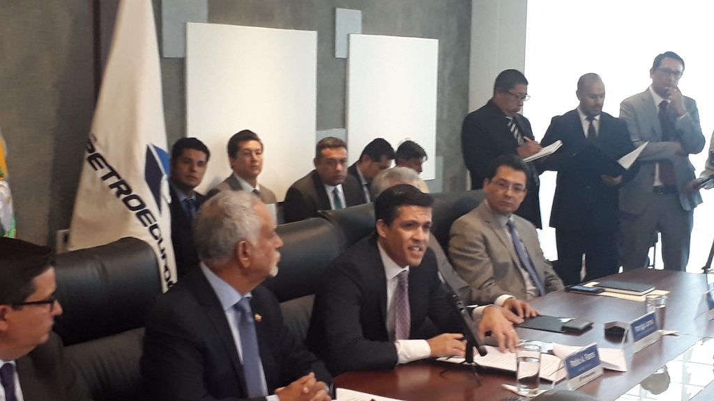 Por su parte, el Ministro de Hidrocarburos, Carlos Pérez, dio a conocer que los resultados de la evaluación, en coordinación con el Programa de las Naciones Unidas para el Desarrollo (PNUD), que se hizo a cinco proyectos petroleros del gobierno anterior. Explicó que la lucha contra la corrupción fue una oferta de campaña del Presidente Lenin Moreno, y en ese contexto se ha llevado un proceso de análisis técnico y económico a los proyectos petroleros de la revolución ciudadana con la ayuda del PNUD, en donde se ha determinado sobreprecios, falta de fiscalización, anormalidades en las contrataciones e inconsistencias en los estudios. «Esta decisión fue tomada para que los criterios sean de manera imparcial con respecto a la situación de los cincos proyectos», enfatizó.