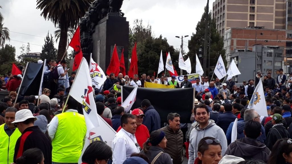 La tarde de este lunes cientos de personas se concentraron en la Plaza Simón Bolívar, frente al Banco Central del Ecuador, para posteriormente movilizarse pacíficamente por la Av. 10 de Agosto hacia la Plaza Grande y así expresar su rechazo a las políticas económicas del Gobierno Nacional.