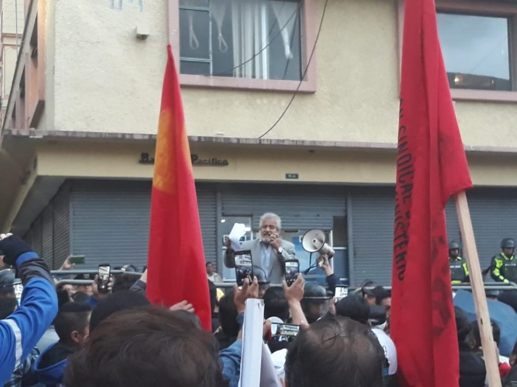 Por su parte Marcelo Solórzano, presidente de la Confederación de Trabajadores del Sector Público (CTSPE), agradeció a los participantes por el apoyo a la marcha y puntualizó que el Gobierno debe rever «Las medidas económicas adoptadas, no más concesiones, derogar el Decreto Ejecutivo 619»; aseveró.