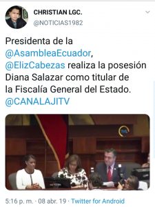 Este lunes, 8 de abril, en la sesión número 585, la presidenta de la Asamblea Nacional, Elizabeth Cabezas, tomó el juramento respectivo y oficializó la posesión de Diana Salazar como titular de la Fiscalía General del Estado, luego de obtener el primer lugar en el concurso público de méritos y oposición realizado por el Consejo de Participación Ciudadana y Control Social Transitorio, CPCCS-T.