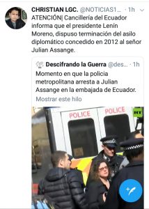 «El otorgamiento y terminación del asilo diplomático es potestad soberana de un Estado», así lo aseveró el presidente Lenín Moreno en la red social Twitter, donde anunció el retiro del asilo a Assange.