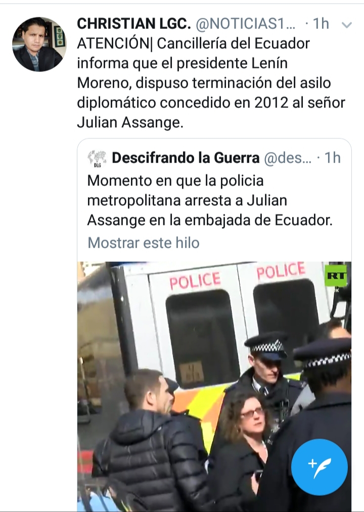 Mediante un comunicado oficial este jueves 11 de abril, el Estado ecuatoriano a través de la Cancillería del Ecuador informó que el presidente de la República, Lenin Moreno Garcés, dispuso la terminación del asilo diplomático concedido en 2012 al señor Julian Assange.