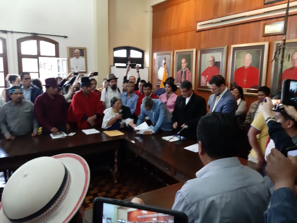 Blanca Chancoso, dirigente indígena entregó la propuesta económica alternativa a José Augusto Briones, secretario general de la Presidencia, quien se comprometió entregar dicho proyecto al presidente de la República Lenín Moreno y analizar las propuestas, en el ánimo de ir construyendo un documento colectivo consensuado entre las partes.