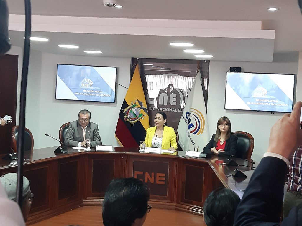 La presidenta del Consejo Nacional Electoral (CNE) Diana Atamaint, junto a Lucy Pomboza, coordinadora Nacional Técnica de Procesos Electorales, mediante una rueda de prensa realizada este martes 11 de febrero de 2020, dio a conocer la situación de la plataforma tecnológica del CNE.