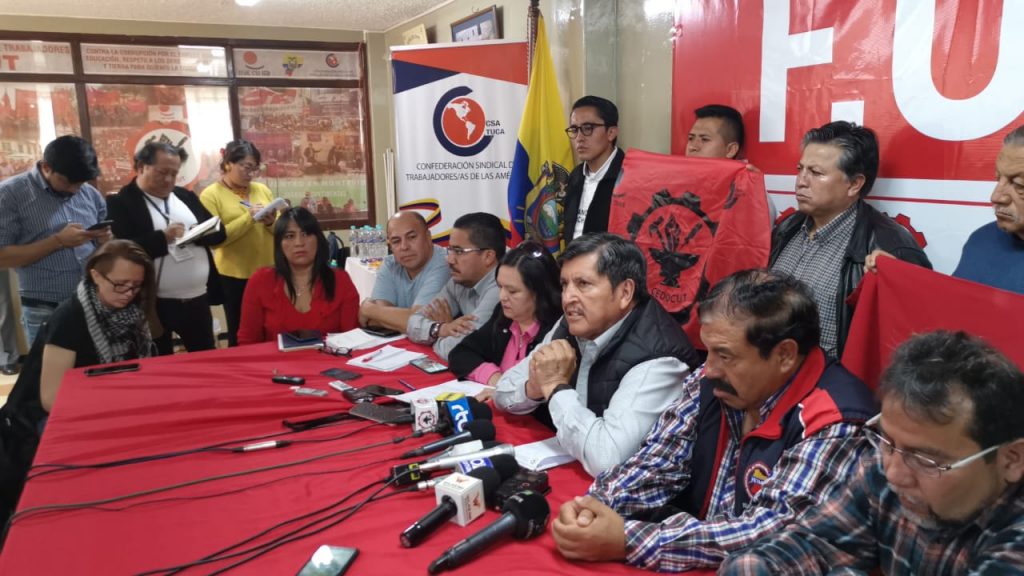 Quito, Pichincha.- Dirigentes del Frente Unitario de Trabajadores (FUT), realizaron una rueda de prensa la mañana de este miércoles 11 de marzo, donde dieron a conocer su posición frente a las decisiones económicas adoptadas por el Gobierno; y de acuerdo a la Convención de los trabajadores, no descartan realizar medidas de protesta amparados en la Constitución.
