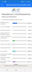 Quito, Pichincha.- La mañana de este lunes 8 de febrero de 2021, el Consejo Nacional Electoral CNE, emitió los resultados con el 97.56 % de actas escrutadas, dónde existe una mínima ventaja del candidato a la presidencia Yaku Pérez por el movimiento Pachakutik, que logra un 19.80% de votos; con respecto al candidato Guillermo Lasso, por la alianza CREO – Socialcristianos que tendría hasta el corte de este mañana de 19.60%