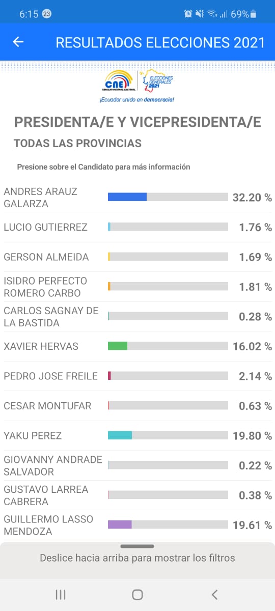 Quito, Pichincha.- La mañana de este lunes 8 de febrero de 2021, el Consejo Nacional Electoral CNE, emitió los resultados con el 97.56 % de actas escrutadas, dónde existe una mínima ventaja del candidato a la presidencia Yaku Pérez por el movimiento Pachakutik, que logra un 19.80% de votos; con respecto al candidato Guillermo Lasso, por la alianza CREO – Socialcristianos que tendría hasta el corte de este mañana de 19.60%