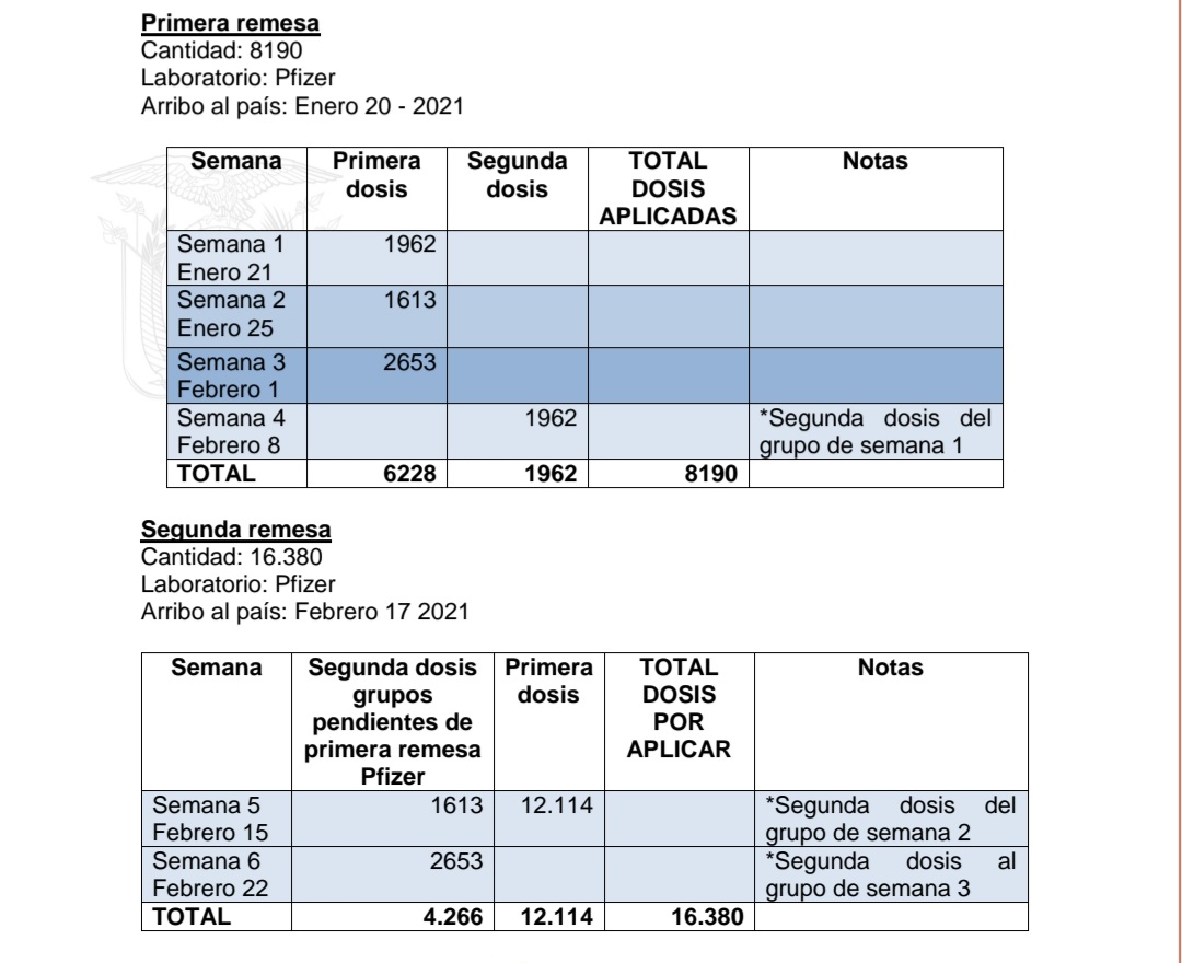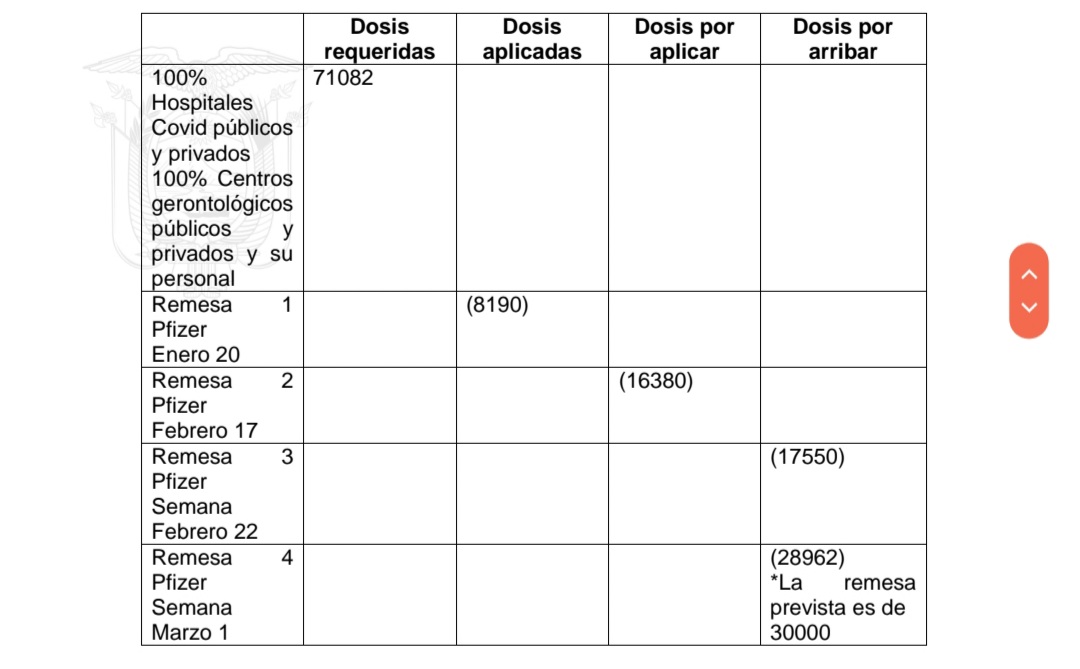 En el comunicado enmarca qué, «con esta segunda remesa de vacunas, se completará el 100% de la vacunación (primeras y segundas dosis) del grupo objetivo inicial de la Fase Cero o Plan Piloto, esto es, de 6.228 ecuatorianos de 99 hospitales COVID públicos y privados del país y adultos mayores de 18 centros gerontológicos públicos y privados del país y su personal».