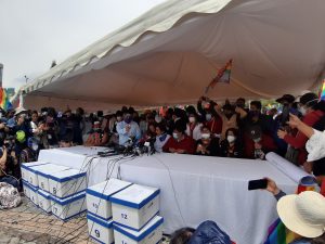 Yaku Pérez Guartambel, candidato presidencial por Pachakutik, junto al Coordinador Nacional de Pachakutik, Marlon Santi; y el director del movimiento político Unidad Popular, Geovanni Atarihuana, presentaron ante el Tribunal Contencioso Electoral (TCE), un último recurso en contra del proceso electoral realizado el 7 de febrero.